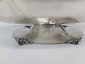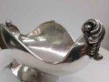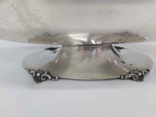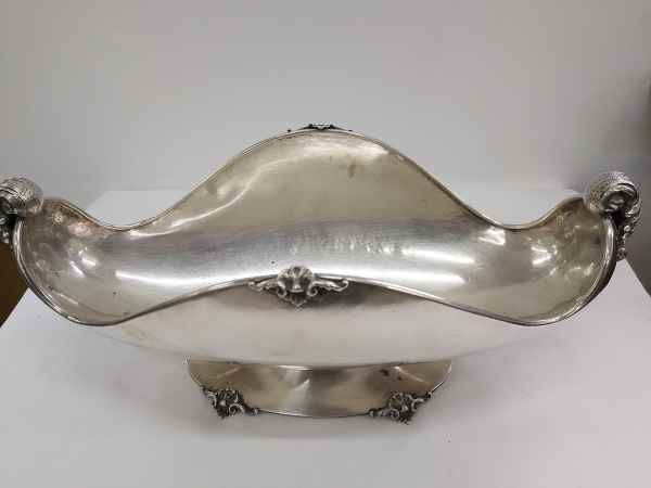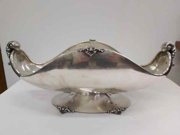 Fructiera Art Nouveau din argint 800.Piesa este realizata din argint masiv puritate 800,cu o forma ovoidala .Are o lucratura superba pe margini cu model floralsi cornul ambundentei stilizat.Sprijin pe 1 picioar oval frumos decorat cu model floral. Dimensiune picior L 16cm / l 9,5cm / H 3,5 cm, Dimensiune fructiera L 32 cm/ l4 cm/ H 11 cm. Dimensiune maxima L 32 cm/l 14 cm /H 14,5 cm ,gramaj 616 g .Conditie excelenta!