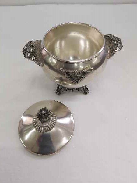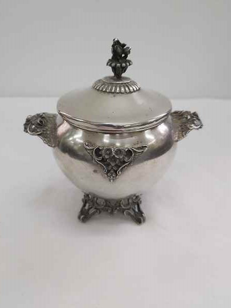 Zaharnita din argint 800.Piesa este realizata din argint masiv puritate 800.Are o lucratura superba cu model floral.,buchete de trandafir.Sprijin pe picior frumos sculptat. Capac detasabil,Dimensiune maxima L 12cm / H 12,5 cm, gramaj 153 g .Conditie excelenta!