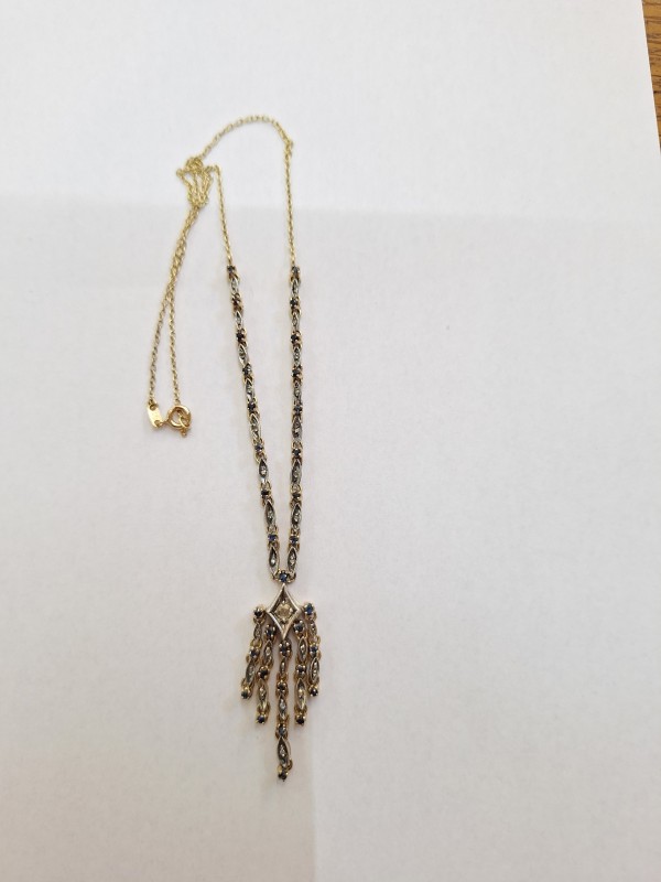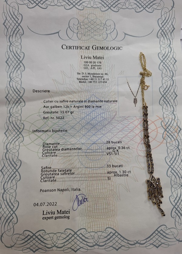 Colier cu Safire si Diamante naturale! Aur galben 12k si Argint 800! 8750 ron. Detalile despre Colier le gasiti in Certificatul Gemologic!