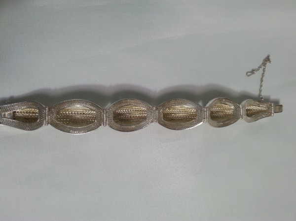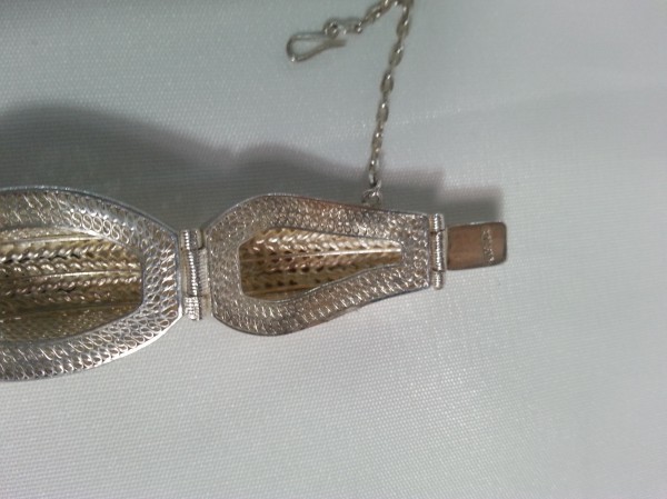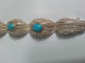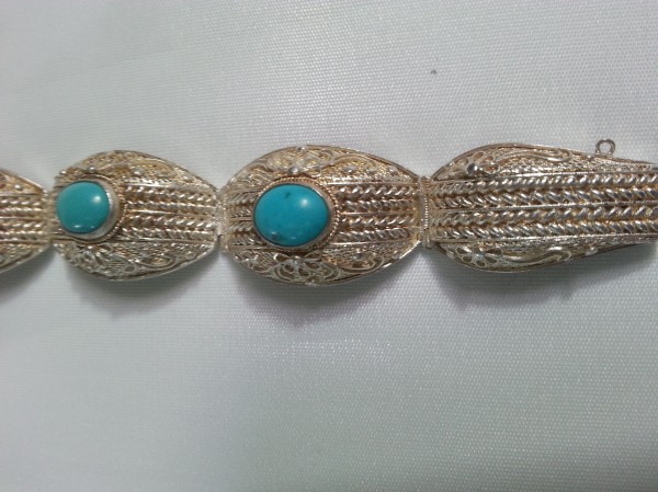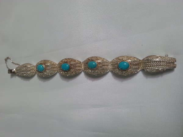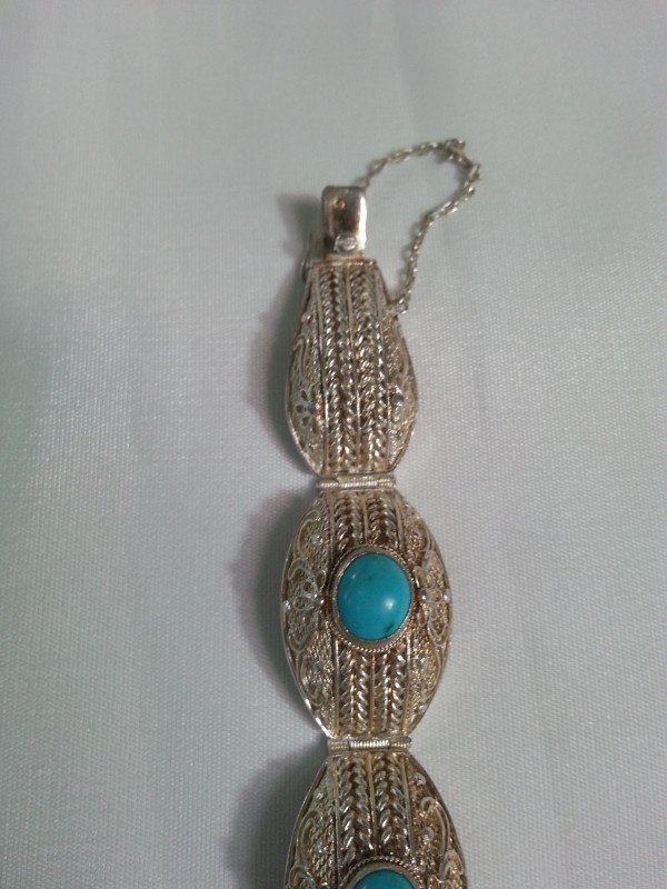 Bratara anii 70din argint filigranat cu 4 turcoaza.Este lucrata manual ,marimea :lungime 17cm.latime2 cm .are inchizatoare gen clapeta.lant de siguranta. Argint de 925.gramaj 32,27g. In perfecta stare(nepurtata)