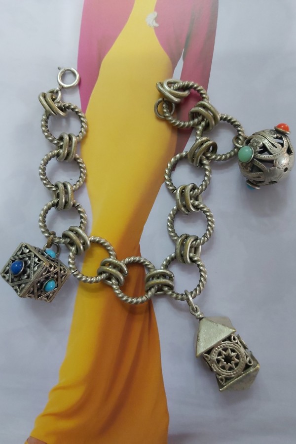 Bratara anii 1960,cupru placat cu argint, 3 charmuri ,marime 20 cm ,conditie excelenta!