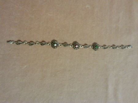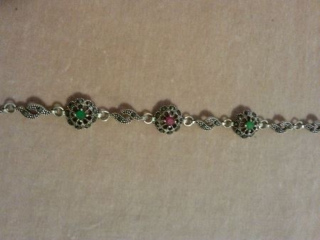 Bratara cu radacina de rubin si smarald si marcasite,are ub rubin central si 2 smaralde,lungime 20 cm,latime 1 cm,gramaj 8 g, argint 925