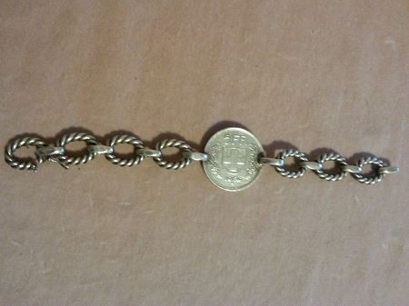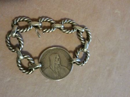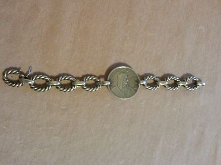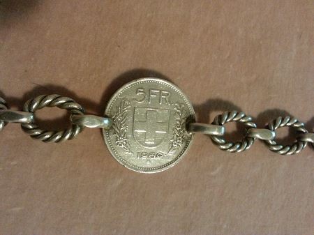 Bratara masica lucrata manual,central are o moneda de 5 Franci Elvetia din an 1969 argint 835,lungime 19 cm,latime za 1,5 cm,diametru moneda 3 cm,argimtul de la zale este de 925,gramaj bratara 48,73