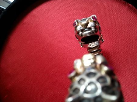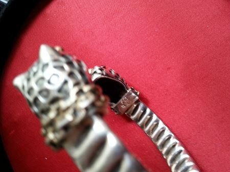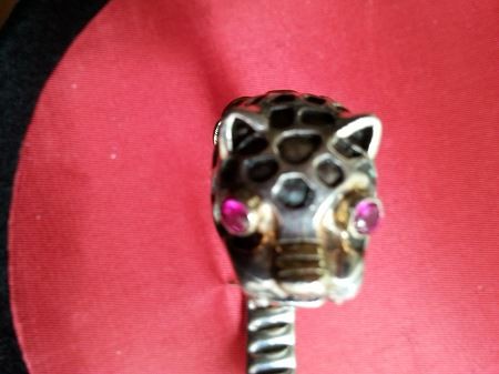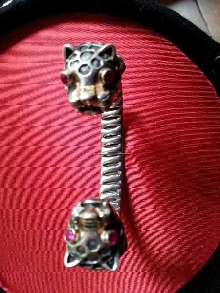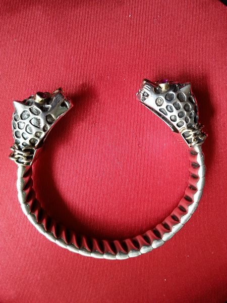 Bratara masiva cu capete de leopard si rubine, lucrata manual,marime totala 20 cm,latime 1 cm ,marime cap leopard 4/2 cm, are 4 rubine naturale pe post de ochisori,gramaj 60,08 g,argint 925 si semnatura de bijutier,