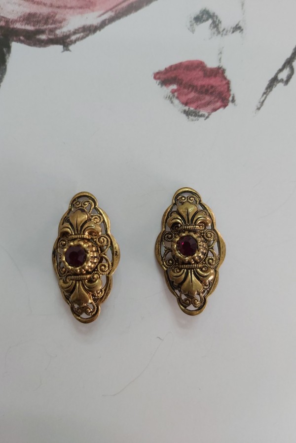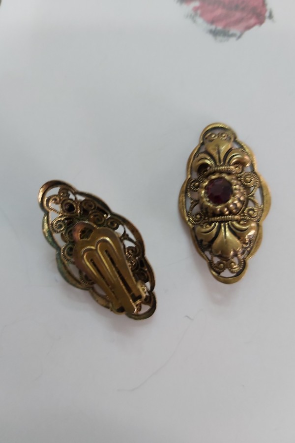 Cercei clips anii 1940 ,filigran de alama si granat de Bohemia,marimea 1,5/3 cm ,conditie excelenta!