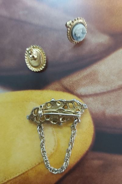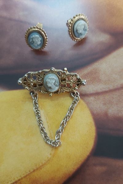Set brosa si cercei cu camee,metal placat cu aur si plastic,marime brosa 3,5/3 cm ,inchizatoare cu siguranta, marime cercei 1,5/1 cm ,inchizatoare cu surub, conditie excelnta!
