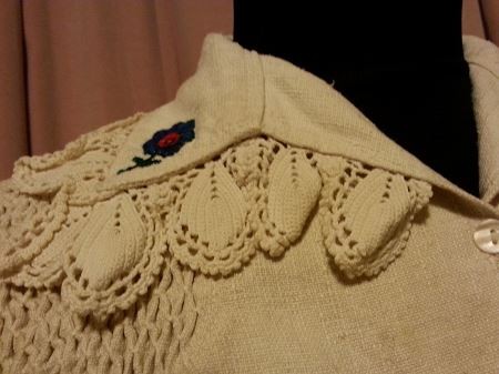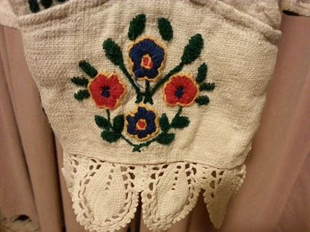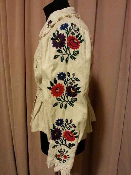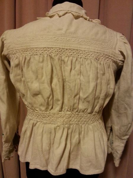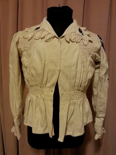 Camasa taraneasca(ie),marime S, marime umar 36cm,bust 100cm,talie 80 cm,maneca 51 cm,lungime camasa 48 cm,se inchide cu 3 nasturei,maneca si gulerasu are dantela crosetata,camasa este efectuata manual,conditie excelenta