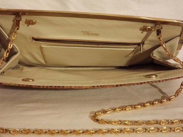 plic retro din piele cu o bentita din piele de sarpe ani 80, 33x19x6 cm , 1 compartiment si 2 buzunar ,captusala din inlocuitor piele, are doua urechiuse din metal la care este atasat lant metalic,conditie aproape perfect