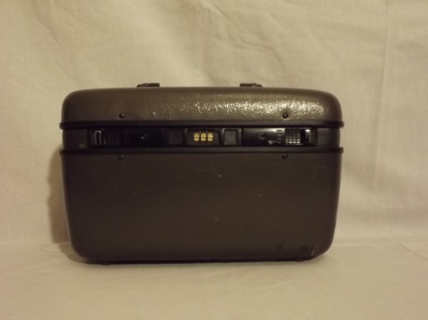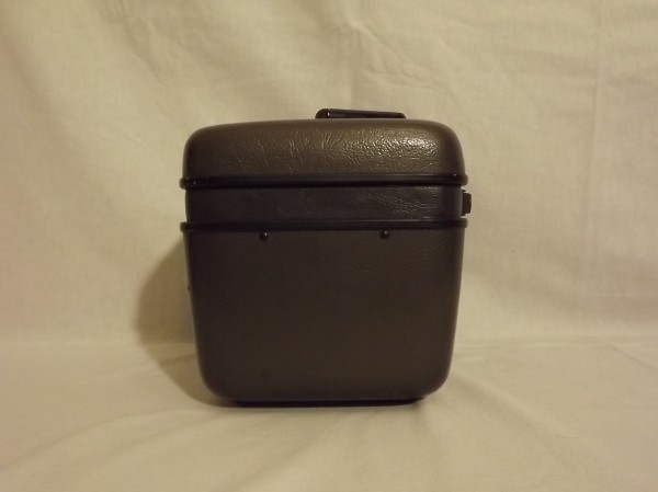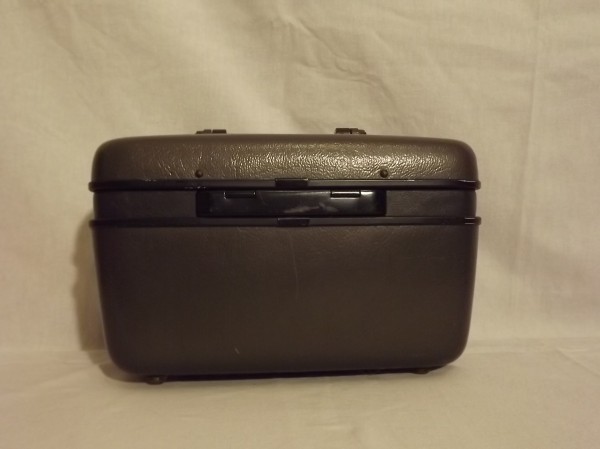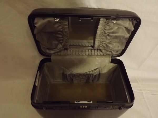 geanta de voiaj retro pentru cosmetice ani 80,20x20x32 cm,material exterior din plastic dur,material interior saten,1 compartiment ,3 buzunare.1 oglinda,1 maner de 27 cm,se inchide cu sistem cifru,conditie foarte bun