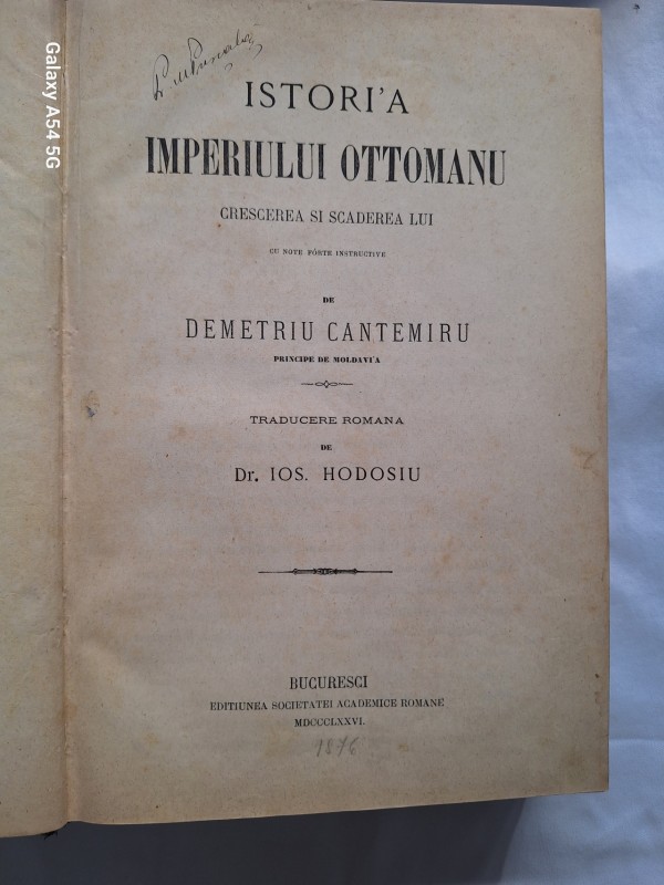 ISTORIA IMPERIULUI OTTOMAN Crescerea si Scaderea lui cu note foarte instructive de DEMETRIU CANTEMIRU PRINCIPE DE MOLDAVIA Traducerea Romana de Dr. IOS HODOSIU Tiparita de Editura Societatei Academice Romane bucuresci 1876. Contine 807+136, Conditie Exclenta!
